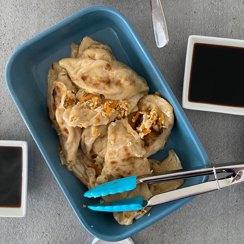 - Huiler une poêle. Faire cuire les gyozas qques minutes. Verser de l’eau à mi-hauteur, couvrir, cuire 5-10 min à la vapeur (s’il n’y a plus d’eau, en rajouter).